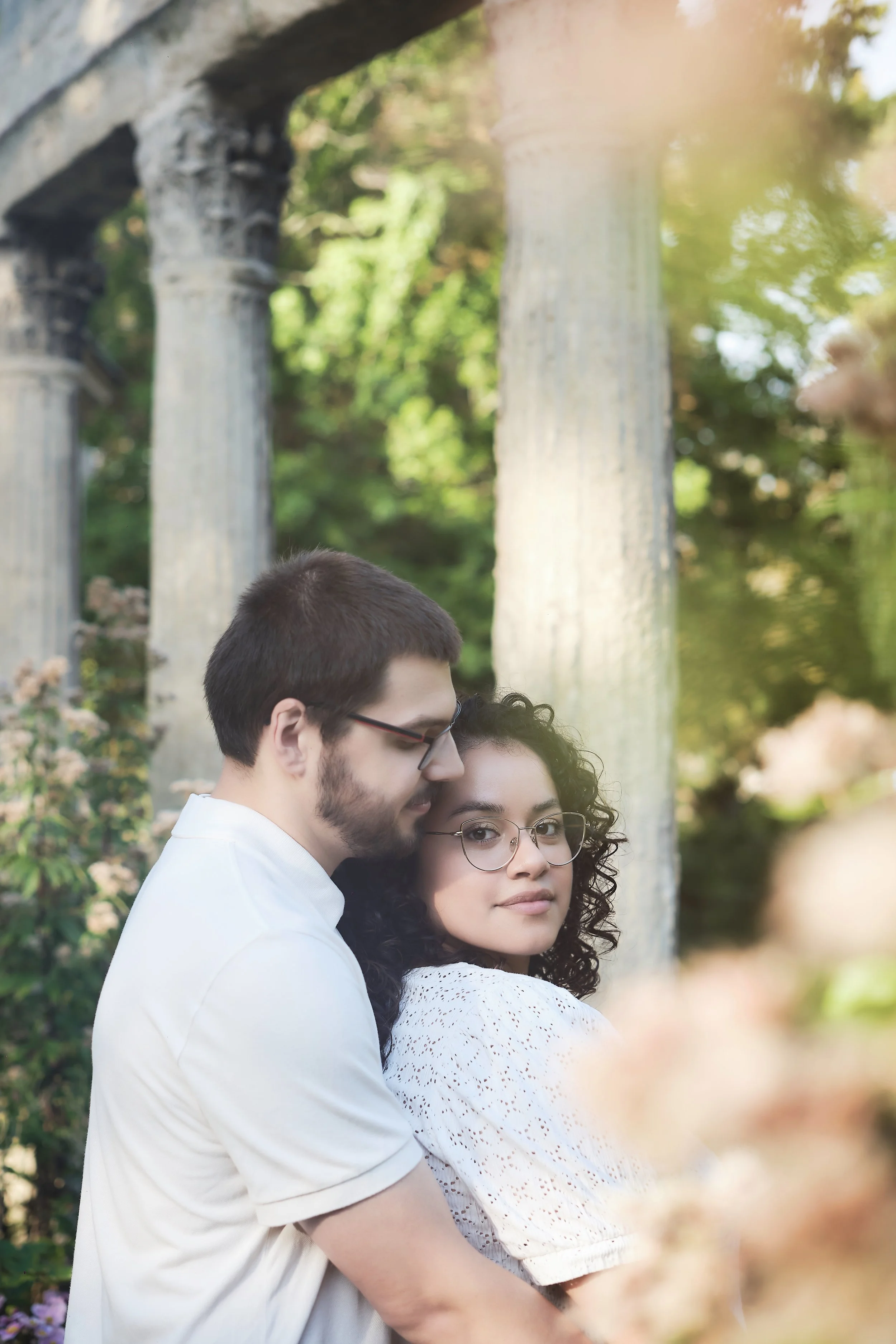 Séance Portrait couple. Un couple, un homme et une femme, dans un parc avec des colonnes antiques en pierre et de la végétation, lors d'une journée ensoleillée.