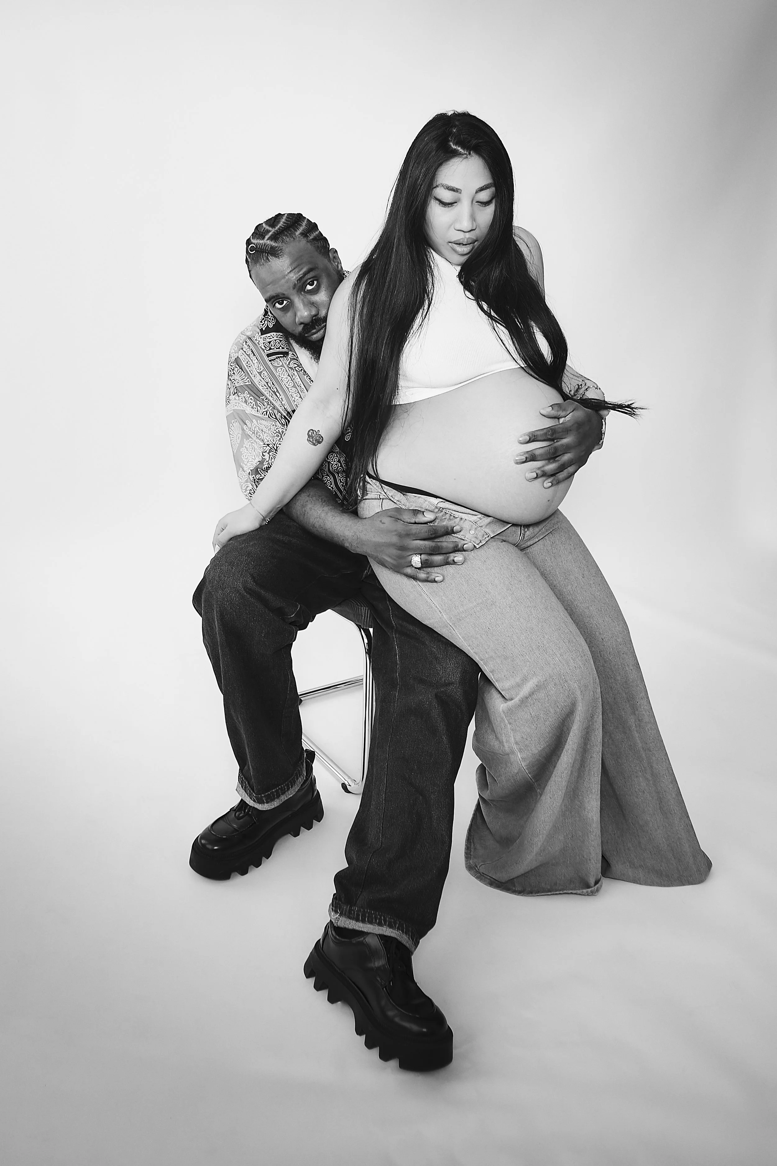 Séance Portrait. Portrait rapproché en noir et blanc d'une personne portant des lunettes de soleil, un bonnet, des boucles d'oreilles et un vêtement à capuche.