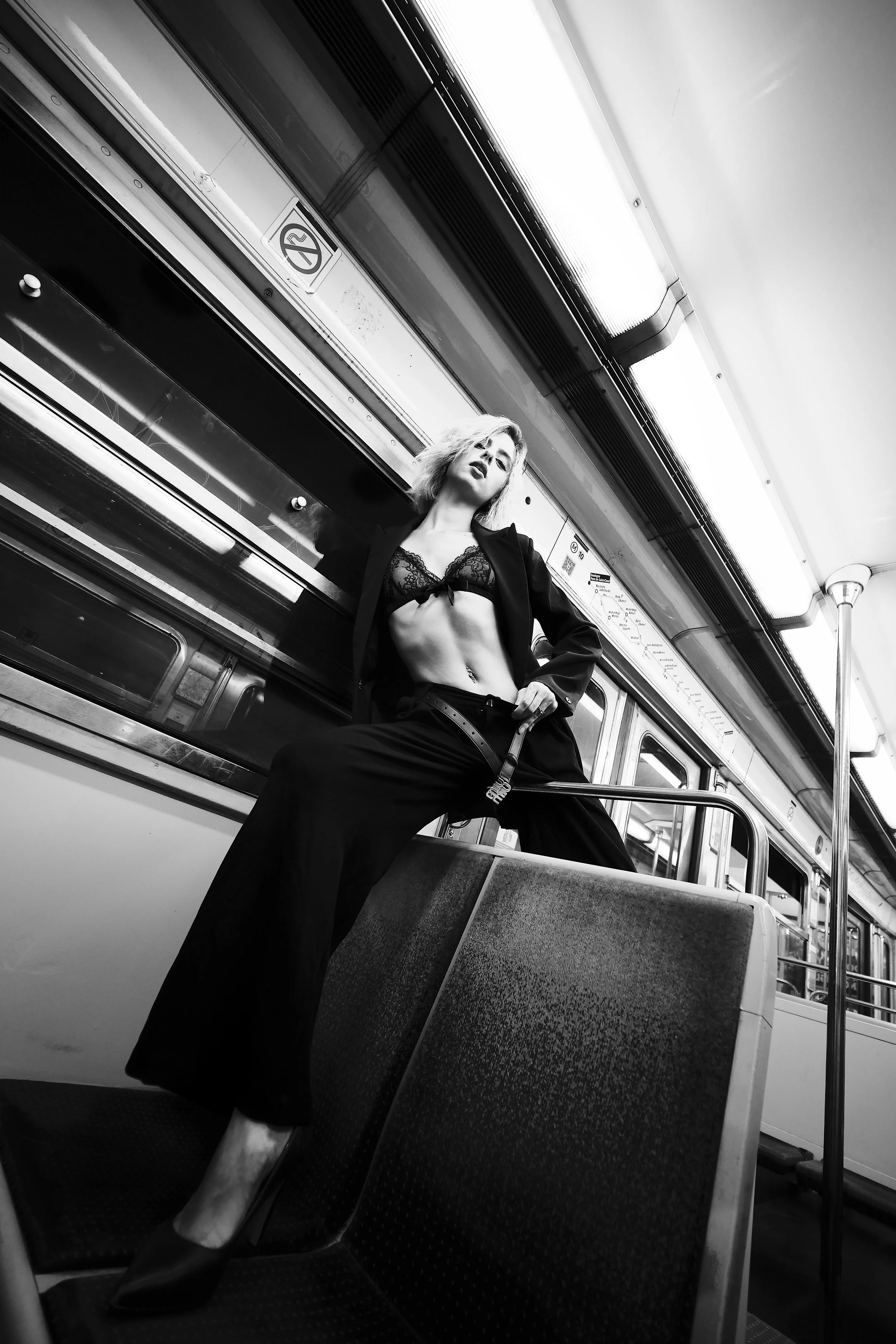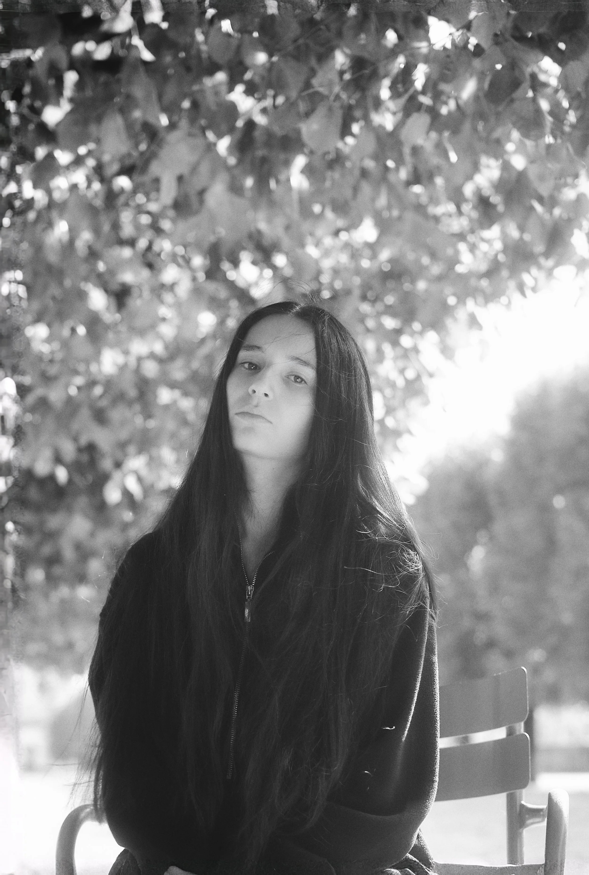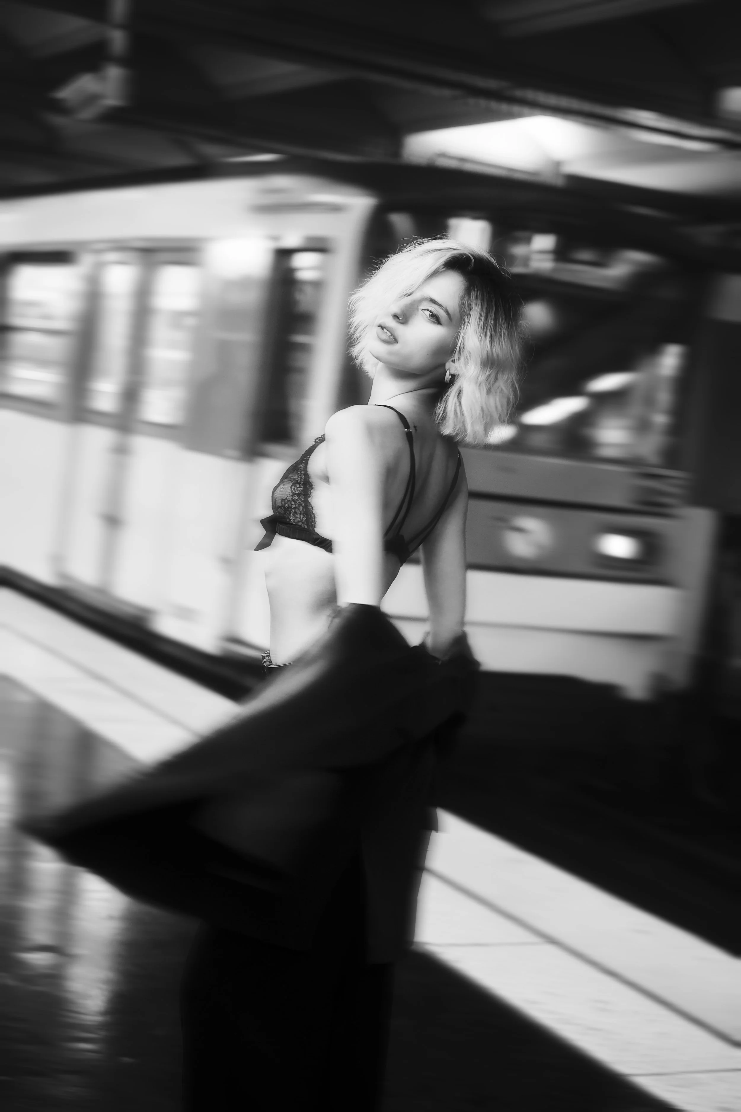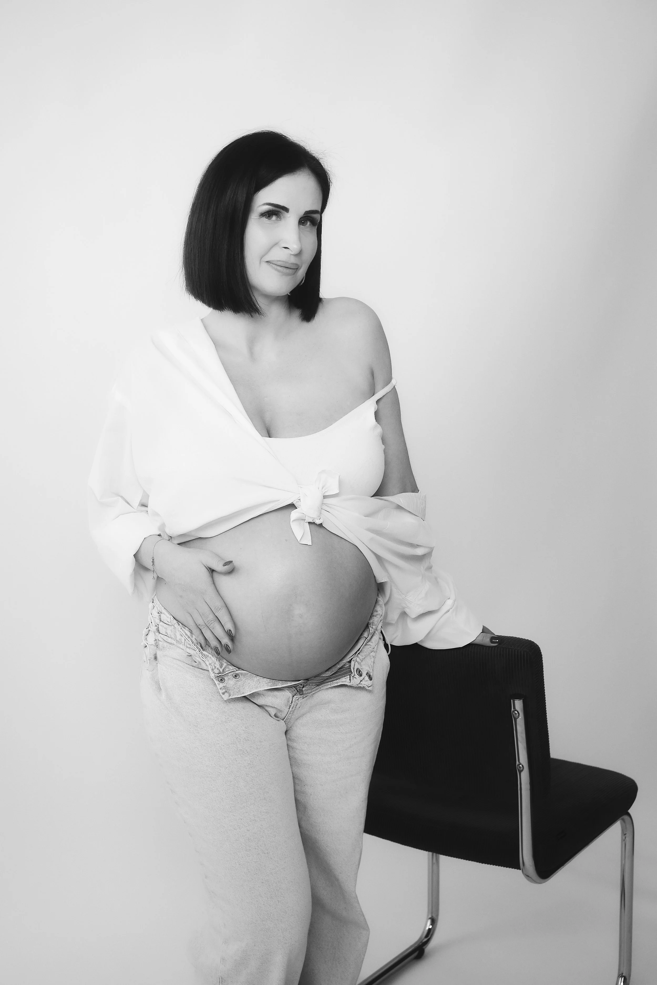 Séance Portrait. Une jeune femme à cheveux longs, portant une chemise blanche et un jean, regarde vers le bas dans une image en noir et blanc.